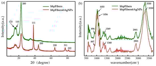 XRD patterns (a) and FT-IR spectra (b) of bhpFibers and bhpFibers@AgNP-based paper.