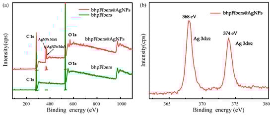 The XPS technique of pristine bhpFibers and bhpFibers@AgNP-based paper could provide further information about the structure and chemical state of AgNPs on cellulose fibers. As depicted in Figure 3a, the pristine bhpFibers showed the binding energy spectra of C1 s peaks (288 eV) and O1 s peaks (533 eV), respectively, which can be inferred to lignocellulosic characteristic peaks of cellulose materials []. After surface modification, Ag3d peaks were observed in the bhpFibers@AgNPs, demonstrating the formation of AgNPs. A high resolution XPS spectra of Ag3d (Figure 3b) was undertaken to analyze the valence state of Ag on the surface of cellulose fibers, it can be seen that the peaks of Ag3d3/2 at 368 eV and Ag3d5/2 at 374 eV appeared, demonstrating that the stable zero-valence AgNPs had been successfully loaded on the bhpFibers surface [,].