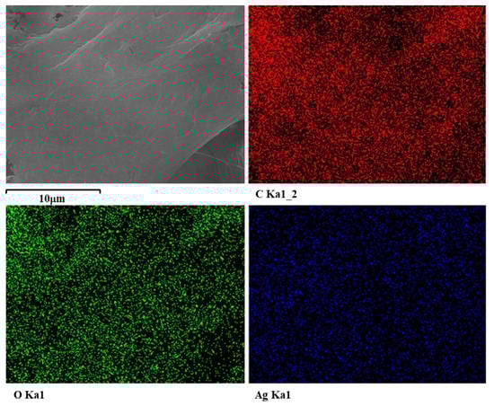 Besides, X-ray energy dispersive spectroscopy mapping (EDS), described in Figure 4, shows that the elements of C, O and Ag were uniformly distributed on the surface of fibers, which also proved that bhpFibers were successfully coated with AgNPs.