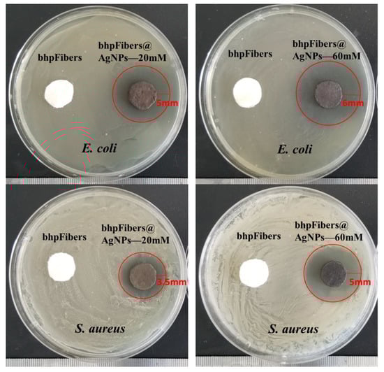 It has been reported that the antibacterial properties of the silver-based nanocomposites are related to the mass of AgNPs in the matrix [,]. Herein, the antibacterial activities of bhpFibers@AgNP-based paper prepared by 20 mM and 60 mM AgNO3 were tested on Gram- negative E. coli and Gram-positive S. aureus, respectively. As presented in Figure 6, no inhibition zones were observed nearby the pristine fiber-based papers, indicating that the papers did not show any antibacterial activity. The inhibition zones of the bhpFibers@AgNP-based papers with 20 mM AgNO3 for E. coli and S. aureus were 5 mm and 3.5 mm, respectively, while the inhibition zones of the bhpFibers@AgNP-based paper with 60 mM silver nitrate for E. coli and S. aureus were 6 mm and 5 mm. These results demonstrated that the prepared papers showed outstanding antibacterial activity against both E. coli (Gram-negative) and S. aureus (Gram-positive). This is because AgNPs can penetrate the cytoplasm of E. coli and S. aureus, and interact with cell components, causing damage to bacteria. Moreover, with the increasing of AgNPs in papers, the inhibition zones against E. coli and S. aureus increased simultaneously. These results clearly indicated that the antibacterial ability only stems from the AgNPs impregnating inside bhpFibers. A better antibacterial effect was obtained accompanied by the increase of silver content in the bhpFibers.