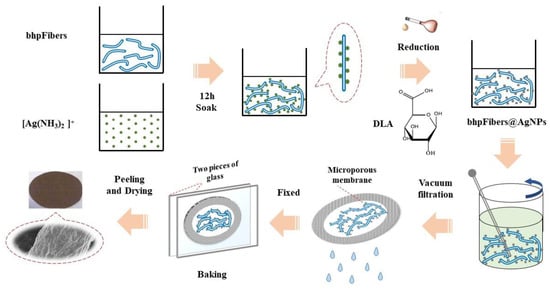 As shown in Scheme 1, the bhpFibers@AgNP-based paper was fabricated via a vacuum filtration process. Typically, the prepared bhpFibers@AgNPs was dispersed in 100 mL deionized water to form a stable pulp suspension under gentle stirring. Then, the suspension was poured into the filtration funnel with a Φ = 0.22 μm microporous membrane. After being vacuum-dried at 60 °C for 12 h, the bhpFibers@AgNP-based paper was successfully prepared. A series of papers with different amounts of AgNPs were also prepared by adjusting the concentration of silver ions in the solution.