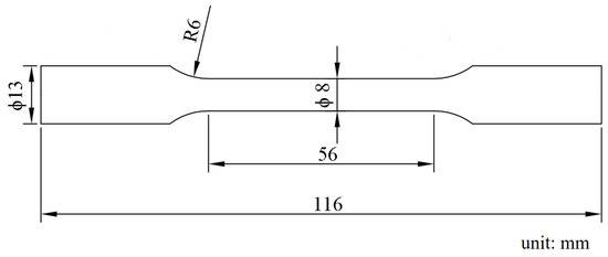 The samples for the microstructure observation were ground on SiC papers and etched with an acetic-picral solution (2 g of picric acid, 3 mL of acetic acid, and 18 mL of anhydrous ethanol). The microstructures were analyzed by optical microscopy (OM, Carl Zeiss, Jena, German) and scanning electron microscope (SEM, VEGA Ⅱ LMU, TESCAN, Brno, Czech Republic). X-ray diffraction (XRD) measurements were conducted using the D/MAX-2500PC (Rigaku, Tokyo, Japan) with Cu Kα radiation. Electron backscatter diffraction (EBSD) was performed using JSM-7800F (JEOL Ltd., Tokyo, Japan) with a step size of 0.5 μm. The specimens for EBSD were ground mechanically and had electrochemical polishing in a commercial AC2 solution. The obtained EBSD data were analyzed by channel 5 software (Oxford Instruments, Oxford, UK). Tensile tests were carried out at room temperature by using an GMT-5105 testing machine (Xinsansi, Shenzhen, China) with a constant strain rate of 2.0 × 10−3 /s. The specimens were machined from extruded bars parallel to the extruded direction (ED). According to the GB/T 16865-2013 standard, the samples were processed into a dog-bone shape by wire cutting. The size of the tested specimen is shown in Figure 1, which has a diameter of 8 mm. In order to ensure the reliability of the experimental data, three tested specimens of each alloy were processed and tested. The reported results are the averages over the three tests.