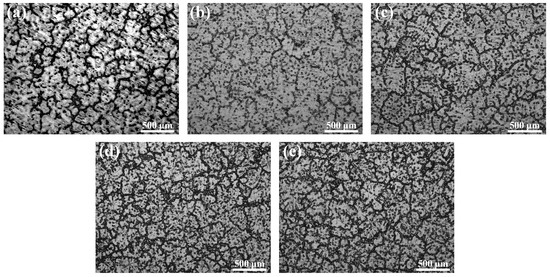 Optical microstructures of the as-cast Mg–6Al–3Sn–0.25Mn–xZn alloys: (a) 0 wt %; (b) 0.5 wt %; (c) 1.0 wt %; (d) 1.5 wt %; (e) 2.0 wt %.