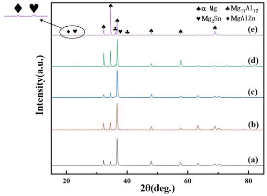 XRD patterns of the as-cast Mg–6Al–3Sn–0.25Mn–xZn alloys: (a) 0 wt %; (b) 0.5 wt %; (c) 1.0 wt %; (d) 1.5 wt %; (e) 2.0 wt %.