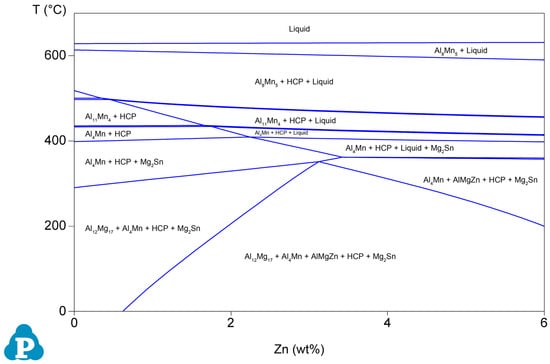 The normalized XRD patterns of the as-cast Mg–6Al–3Sn–0.25Mn–xZn alloys are presented in Figure 3. All of the as-cast alloys contain three phases: α-Mg, Mg17Al12, and Mg2Sn. When the addition of Zn exceeds 1.5 wt %, the diffraction peak of the MgAlZn phase begins to appear, which means that the number of the second phase containing Zn increases. Combined with the phase diagram (Figure 4), it can be further determined that MgAlZn does exist in the alloys with a higher Zn content. Furthermore, the peak intensity of Mg2Sn is significantly enhanced with the addition of Zn. This implies that the addition of Zn promotes the precipitation of the Mg2Sn phase because of the increase of nucleation sites.