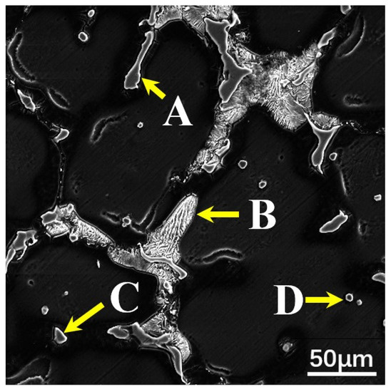 The SEM micrograph and Energy Dispersive Spectrometer (EDS) analysis of the second phase in the Mg–6Al–3Sn–0.25Mn–xZn alloys are shown in Figure 5 and Figure 6, respectively. Four types of second phases are present in the alloys system. For the Mg–6Al–3Sn–0.25Mn alloy, there are mainly Mg17Al12 phases in the matrix [18]. With the introducing addition of Zn, strip and lamellae structures are observed in the alloys. Combined with XRD results and chemical composition in Table 2, it can be determined that the strip structure is the MgAlZn phase (as shown in point A) [19]. Meanwhile, the lamellae structure is considered to be a mixture of the MgAlZn phase and Mg2Sn phase (as shown in point B). Because of the positive enthalpy between Sn with Al and the repulsive interaction between Sn and Zn, the MgAlSn or MgZnSn ternary phases cannot form, but the Mg2Sn phase coexists with the Mg17Al12 and MgAlZn phases [20,21,22]. As the Zn content increases, the strip and lamellae structures gradually develop into coarse network structures, which restrict the growth of the dendrites in the as-cast alloys. It is believed that the coarse eutectic mixture deposits adversely affect the mechanical properties of the as-cast alloys [23]. Additionally, granular second phases are detectable within the grains. Based on the EDS results, the granular second phase is mainly the MgAlZn phase (as shown in point C) and Al–Mn phase (as shown in point D).