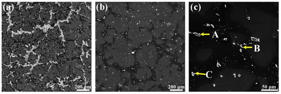 SEM micrographs of Mg–6Al–3Sn–0.25Mn–2Zn alloy: (a) as-cast; (b) solid-solution state (low magnification); (c) solid-solution state (high magnification); (point A and point C) a mixture of the MgAlZn phase and Mg2Sn phase; (point B) Al–Mn phase.