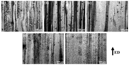 Optical microstructure of the as-extruded Mg–6Al–3Sn–0.25Mn–xZn alloys: (a) 0 wt %; (b) 0.5 wt %; (c) 1.0 wt %; (d) 1.5 wt %; (e) 2.0 wt %.