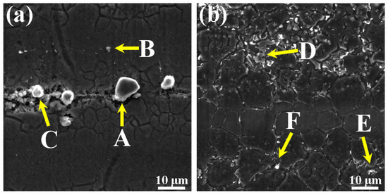 In order to confirm the distribution of the second phase after the solution treatment, the microstructure of the Mg–6Al–3Sn–0.25Mn–2Zn alloy is observed, as shown in Figure 7. Compared with the as-cast alloy, the amount of second phases in the solid solution of the Mg–6Al–3Sn–0.25Mn–2Zn alloy are significantly reduced. The bulky strip and lamellae phases are completely dissolved in the matrix, with only a portion of the small particle phase present. The distribution of the second phase becomes more dispersed. It is known from the phase diagram that the Al–Mn phase (as shown in point B) cannot be dissolved into the matrix. The components of these small particles are detected by EDS, and the results are listed in Table 3. In addition to the Al–Mn phase, there are a few MgAlZn and Mg2Sn phases (as shown in point A and C) distributed on the grain boundary and inside the grains.