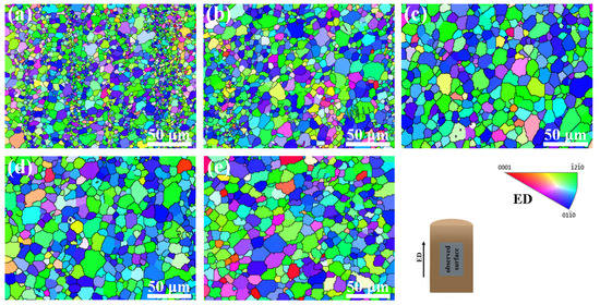 Electron backscatter diffraction (EBSD) inverse pole figure (IPF) maps of the as-extruded Mg–6Al–3Sn–0.25Mn–xZn alloys: (a) 0 wt %; (b) 0.5 wt %; (c) 1.0 wt %; (d) 1.5 wt %; (e) 2.0 wt %.