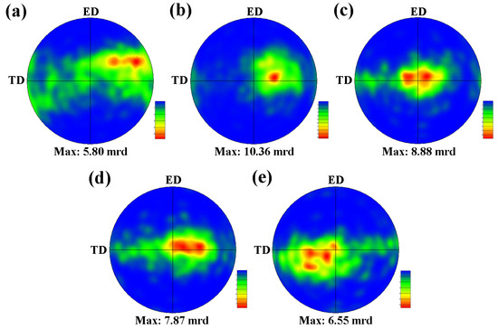 (0001) Pole figures of as-extruded Mg–6Al–3Sn–0.25Mn–xZn alloys: (a) 0 wt %; (b) 0.5 wt %; (c) 1.0 wt %; (d) 1.5 wt %; (e) 2.0 wt %.