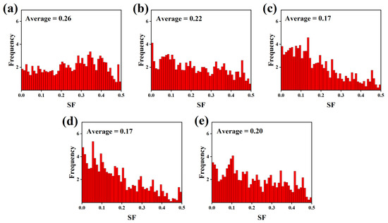 Distribution of the (0001) <1120> basal slip Schmid factor in the as-extruded Mg–6Al–3Sn–0.25Mn–xZn alloys: (a) 0 wt %; (b) 0.5 wt %; (c) 1.0 wt %; (d) 1.5 wt %; (e) 2.0 wt %.
