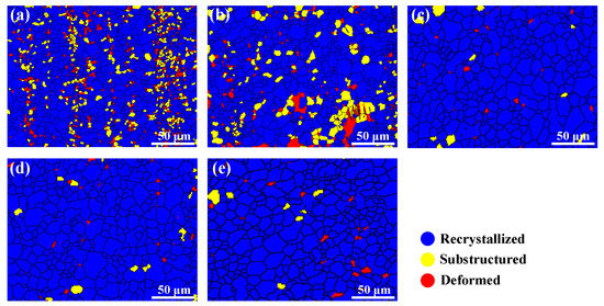 Recrystallized fraction component of the as-extruded Mg–6Al–3Sn–0.25Mn–xZn alloys: (a) 0 wt %; (b) 0.5 wt %; (c) 1.0 wt %; (d) 1.5 wt %; (e) 2.0 wt %.