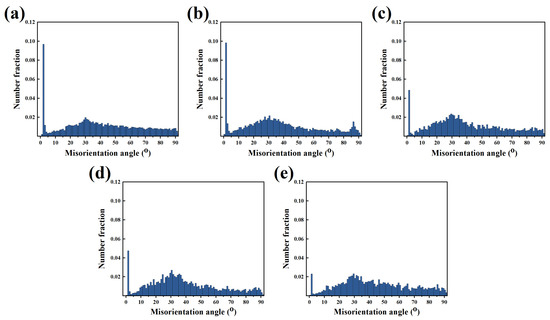 Misorientation angle distributions for the as-extruded Mg–6Al–3Sn–0.25Mn–xZn alloys: (a) 0 wt %; (b) 0.5 wt %; (c) 1.0 wt %; (d) 1.5 wt %; (e) 2.0 wt %.