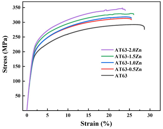 Stress–strain curves of as-extruded Mg–6Al–3Sn–0.25Mn–xZn alloys.