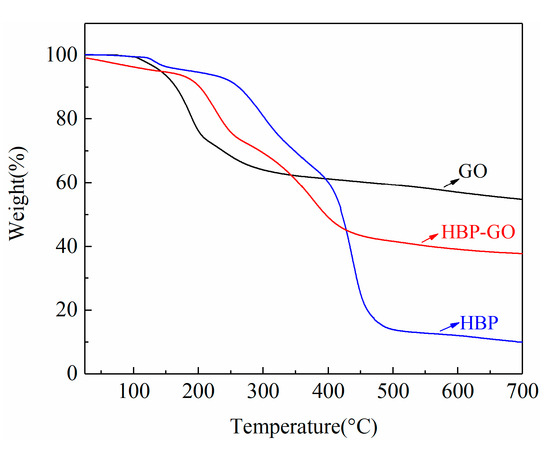 The TGA test results of GO, HBP and HBP-GO are shown in Figure 2. The mass of HBP adsorbed on the GO can be calculated by analyzing the TGA curve. As shown in Figure 2, the thermal weight loss of GO in the range of 160–240 °C is greatly increased due to the decomposition of a large number of unstable oxygen-containing functional groups on the GO nanosheets (OH and COOH). Meanwhile, a stable weight loss was observed at 300–700 °C, which can be attributed to the decomposition of the carbon structure of GO and the residual weight was about 54.75 wt%. According to the TGA curve of HBP-GO, the thermal stability of HBP-GO is better than that of GO. The initial decomposition temperature increases from 160 °C to 220 °C, and the sharp decomposition temperature occurs in the range of 230–380 °C. By comparing the TGA test results of HBP and HBP-GO, it can be found that both of them decompose violently near 380 °C and tend to be stable at 600 °C, which indicates that the weight loss occurring around 380 °C is mainly due to the decomposition of HBP adsorbed on the surface of GO and the residual weight of HBP-GO was about 37.72 wt%. Combined with the final residue weight of HBP, it can be calculated that the quantity of HBP adsorbed on GO is about 38.14 wt%.