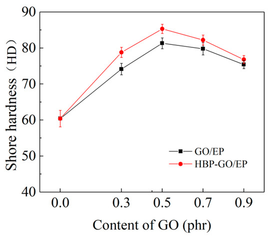Figure 6 shows the results of microhardness testing of EP, GO/EP and HBP-GO/EP, respectively. It can be seen that the microhardness of GO and HBP-GO reinforced epoxy composites is improved compared with pure EP. The microhardness of the 0.5 phr HBP-GO/EP composites reaches the maximum value of 84.5 HD, which was 40.83% higher than that of pure EP and was 5.12% higher than the 0.5 phr GO/EP composites. This is because the GO nanosheets possess high strength (75 GPa) and the their dispersibility in the epoxy composite may affect their bearing force state. When they are pressed by external load, the uniformly dispersed HBP-GO nanosheets in the EP matrix can effectively bear part of the load, which enhances the ability of the HBP-GO/EP composites to resist plastic deformation or damage, which effectively improve the microhardness of the EP composites.