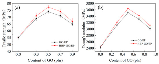 The test results of tensile properties of different content of GO nanosheets reinforced epoxy composites are shown in Figure 7. Obviously, as the HBP-GO content increases from 0.3 phr to 0.9 phr, the tensile strength and Young’s modulus of the HBP-GO/EP composites exhibit a tendency to increase first and then decrease. When the HBP-GO content is 0.5 phr, the tensile strength and Young’s modulus of the epoxy composite (0.5 phr HBP-GO/EP) reach the maximum values (77.8 MPa and 3658.34 MPa), which are increased by 41.4% and 49.9% than those of the EP. Also, compared with the unmodified GO reinforced epoxy composites (GO/EP), they are increased by about 6.5% and 5.7%, respectively. This indicates that the non-covalent functionalization method adopted in this paper significantly improves the enhancement effect of GO. However, as the content of HBP-GO increases (0.9 phr), the enhancement effect will decrease because a part of HBP-GO produces agglomeration. According to the above results, the enhancement effect of HBP-GO may be derived from the following two reasons. Firstly, the dispersibility of HBP-GO is effectively improved after non-covalent functionalization. HBP-GO can withstand loads more effectively in the EP matrix compared with the untreated GO shown in Figure 4a. Secondly, HBP-GO/EP achieved an enhanced effect due to the improvement of interfacial energy and adhesion between HBP-GO and EP.
