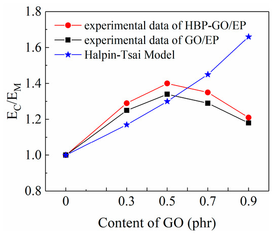 There is a reasonable agreement between the predicted and experimental values until 0.5 phr of GO for the composites. When it is bigger than 0.5 phr, the experimental modulus begins to fall below the prediction. As is shown in Figure 8, when the content of GO reaches 0.9 phr, there is a large deviation between the predicted and experimental modulus, and the test modulus is much lower than the predicted modulus. Moreover, the experimental modulus of HBP-GO/EP composites is higher than that of GO/EP. This trend could be explained by two circumstances. Firstly, the dispersibility of HBP-GO in EP began to decrease when the content of HBP-GO exceeded 0.5 phr. Secondly, after functionalization with HBP, the dispersibility and interfacial properties of HBP-GO in the epoxy group are significantly improved. In summary, under the condition of uniform dispersion of HBP-GO, Halpine-Tsai can be used to predict the lower limit of the experimental modulus of the epoxy composites.