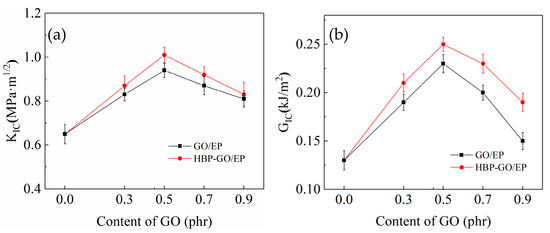 Figure 9 shows the test results of the KIC and GIC of GO and HBP-GO reinforced epoxy resin composites. It can be found that the KIC and GIC of the pure EP are 0.75 MPa·m1/2 and 0.19 KJ/m2, respectively. The KIC and GIC of GO/EP and HBP-GO/EP are higher than those of pure EP and the HBP-GO has a better enhancement effect. When the HBP-GO content is 0.5 phr, the KIC and GIC of the HBP-GO/EP composites reach 1.01 MPa·m1/2 and 0.26 kJ/m2, which are increased by 35.7% and 36.8% than the pure EP and increased by 7.45% and 13.04% than those of 0.5 phr GO/EP (0.94 Mpa·m1/2 and 0.23 kJ/m2). The reasons are as follows: Firstly, This is because HBP-GO is dispersed in the EP matrix uniformly and the interfacial properties with the resin matrix is pretty good (Figure 4b). Secondly, the HBP on the surface of the GO can coordinately deform with the epoxy system during the curing process. It absorbs more energy and provides sufficient guarantee for the toughening effect of GO. Therefore, HBP-GO has an effective toughening effect on epoxy resin, and HBP-GO/EP composite has higher fracture toughness.