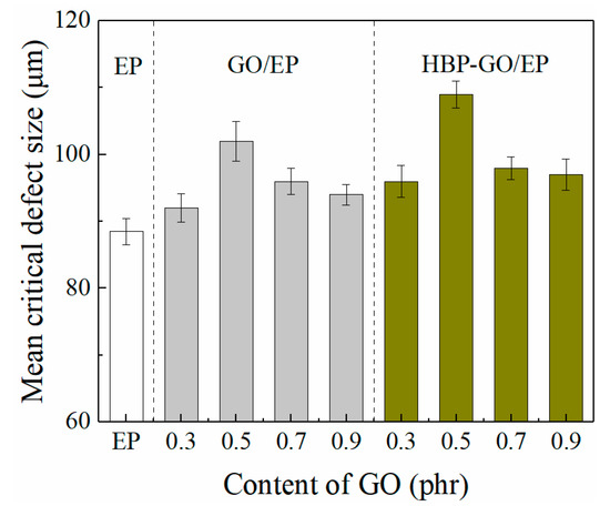 Figure 10 shows the average critical microcrack length of the composites. It can be found that for the pure EP, the critical microcrack length is approximately 88.5 μm, which is the smallest in all the tested samples. Both GO and HBP-GO can increase the critical crack length of EP, in which HBP-GO has a better enhancement effect. When the HBP-GO content is 0.5 phr, the critical crack length of the HBP-GO/EP composite reaches a maximum of 109 μm, which is 120% bigger than that of the pure EP and 6.7% bigger than the GO/EP (102 μm). This is because HBP-GO helps to release the internal stress of the material, improving the interface between the HBP-GO and the matrix, thereby increasing the critical crack length.