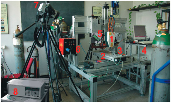 A view of experimental setup equipped with the high power direct diode laser (HPDDL) ROFIN SINAR DL020 (1), positioning system (2), mounting device (3), computer control system (4), pyrometer IMPAC IS 140 (5), electronic controller (6), infrared camera ThermaCAM P640 (7), and multichannel numerical recorder Agilent 34970A (8).