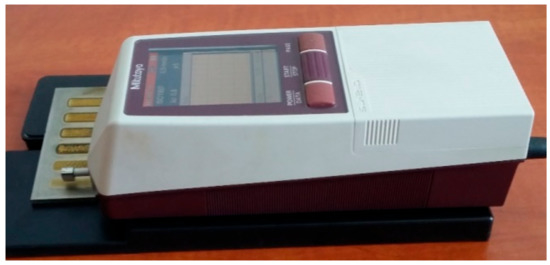 A view of the portable surface roughness tester SJ-210 Surftest Mitutoyo during measurements of roughness on the surface of stringer beads produced by laser gas nitriding of titanium alloy Ti6Al4V.