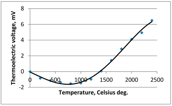 Additionally, high temperature, nonstandard thermocouple W-Mo with the measurement range up to 2400 °C, was used to calibrate the pyrometer. The characteristic of W-Mo thermocouple was determined based on the data provided by Caldwell, Michalski et al., and Blatt et al., as shown in Figure 4 [27,28,29].