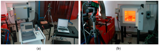 A view of experimental setup: (a) with an electronically controlled furnace and high temperature pyrometer IMPAC IS 140; (b) a view of temperature measurements on the surface titanium alloy sample in a high temperature range.