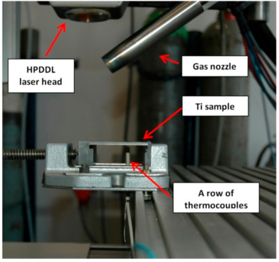 So far, the process of titanium nitriding has been carried out mainly by solid state Nd:YAG (Yttrium-Aluminum Garnet doped with neodymium ions) and gaseous CO2 lasers that emit radiation with a wavelength of 1.06 and 10.6 µm, respectively [7,8,9,10,11,12,13,14,15,16,17,18,19,20,21]. The next generation of lasers recently introduced to the industry are high power diode lasers. These lasers show some advantages in the field of laser surface treatment, compared to the above mentioned solid state and gaseous lasers [7,10,22,23]. Diode lasers provide a favorable rectangular shape of the laser beam spot, and uniform energy distribution across the spot, and also are characterized by a short wavelength in the very near infrared range from 0.808 to 0.960 µm, which is advantageous because of the relatively high absorptivity on the surface of most metals, particularly as compared to the gaseous CO2 lasers with a wavelength of 10.6 µm [11]. However, to ensure stable and reproducible processing conditions, a precise control of heat input during laser processing is required. The “heat input” is often used as synonymous with the “energy input”. However, the energy input is defined as the amount of energy per unit of a length: