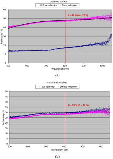 Thus, the value of absorption for the 808 nm wavelength radiation on the polished surface of titanium alloy Ti6Al4V was about 52%, as is apparent from Figure 8a. On the other hand, the total reflection from the surface of the as-received titanium alloy sheet was much lower and reached about 28% (Figure 8b). In this case the absorption was about 72%. Significantly lower reflection and simultaneously higher absorption were due to higher roughness and a thin layer of oxides that were present on the surface at delivery conditions. As can be seen there was no distinct difference between the diffuse and the total reflection in the case of as-delivered surface conditions (Figure 8b). It means that the radiation was strongly scattered after reflection from the surface of the titanium alloy.