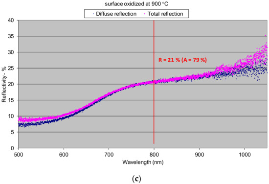 Reflectivity of the surfaces of titanium alloy Ti6Al4V determined at room temperature: (a) polished surface (surface roughness Ra 0.04); (b) as-received conditions (surface roughness Ra 0.4, thickness of the oxide surface layer approx. 1–2.5 µm); (c) oxidized at 900 °C (surface roughness Ra 25, thickness of the oxide surface layer approx. 2.5–8 µm).