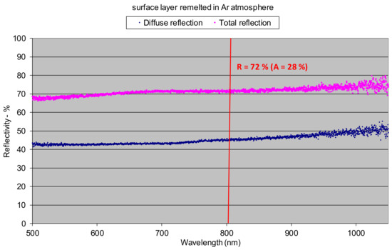 Reflectivity of the surface layer produced by laser melting of titanium alloy Ti6Al4V by HPDDL in pure argon, determined at room temperature (bead No. 8 in Figure 9, parameters of processing; laser power 1.8 kW, scanning speed 400 mm/min, energy input 270 J/mm, surface roughness Ra 1.1).