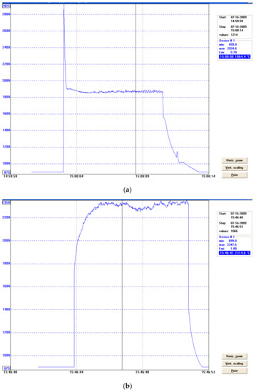 The emissivity of the pyrometer was determined experimentally in such a way as to achieve compliance of indications between the pyrometer and thermocouple. Results of the tests, measurements, and analyses are given in Figure 7, Figure 8, Figure 9, Figure 10, Figure 11, Figure 12 and Figure 13 and Table 2.