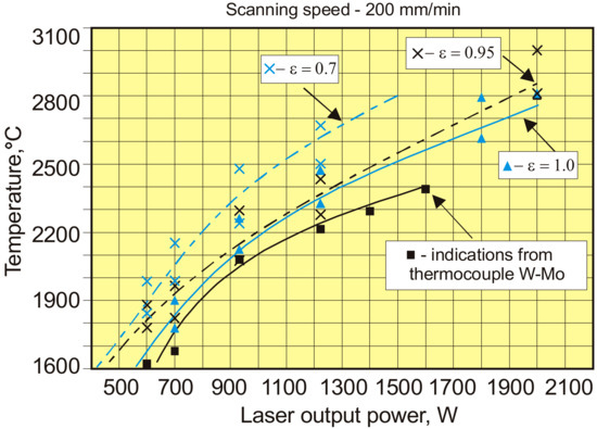 The normal spectral emissivity of the tested surfaces of titanium alloy and surface layers for the spectral range 0.7–1.1 µm of the pyrometer IMPAC IS 140 was determined by adjusting the value of emissivity so as to obtain the compliance of the indication of the temperature by the pyrometer and the thermocouple at elevated temperatures and also during laser surface melting in argon and nitrogen atmospheres (Figure 1 and Figure 13, Table 2). The results obtained during measuring the temperature of the melt pool were most interesting (Figure 12 and Figure 13.)