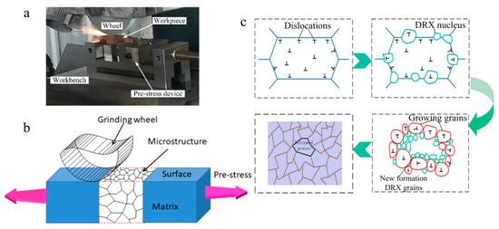 (a) The pre-stress hardening grinding (PSHG) experimental setup; (b,c) Schematic diagram for forming dynamic recrystallization (DRX) grains.