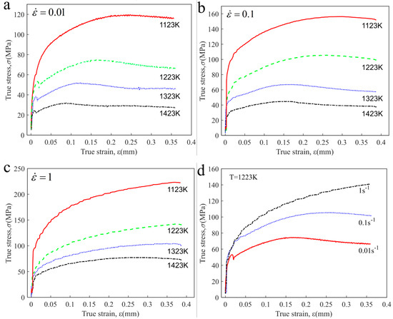 True stress-strain curves of 42CrMo steel at different conditions: (a) = 0.01; (b) = 0.1; (c) = 1; (d) T = 1223 K.
