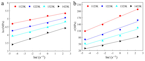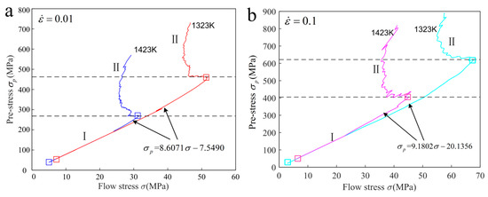 Due to workpiece deformation mostly depending on pre-stress in PSHG, the interaction between work hardening and DRX softening on microstructure evolution is constant under a certain pre-stress. Experimental study shows that the flow stress is closely interrelated with pre-stress, and their relationship at deformation temperatures of 1323 K and 1423 K is shown in Figure 7a,b. It can be found that curves include two stages. At the first stage, flow stress shows a linearly increasing trend with increasing pre-stress. For the second stage, the flow stress shows a decrease first and then restores a trend as pre-stress increases. In addition, from the figure the curves are sensitive to strain rate, but temperature has almost no effect on it. The stress dependence model up to saturated flow stress can be calculated from the first stage. Though linear fitting analysis, the relationship between flow stress and pre-stress can be given as follows: