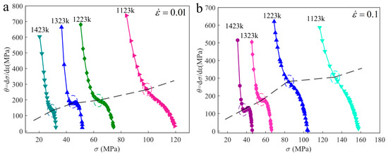 The hardening rate curves under different strain rates (a) = 0.01 s−1; (b) = 0.1 s−1.