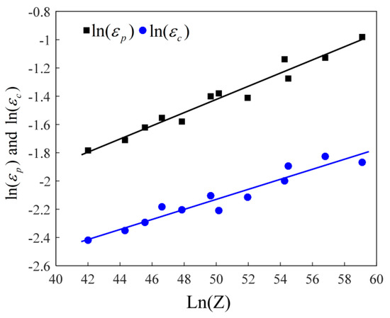 Generally, there is a power function among peak strain (), critical strain (), and Z parameter [24,25]. The relationship between and is plotted in Figure 6. By substituting the values of and XDRX into Equation (7), the material constants KD and nD can be calculated as 0.4789 and −0.2903, respectively.