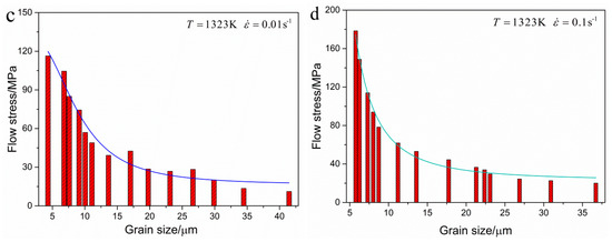 As shown in Figure 7c,d, the power function curves are obtained though fitting the experimental results at the temperature of 1323 K and strain rate of 0.01 s−1 and 0.1 s−1. It can be found that the average grain size decreases as flow stress increases. The DRX grain size is not only sensitive to pre-stress, but also sensitive to strain rate and temperature. At a specific temperature of 1323 K, the grain size models are obtained by nonlinear fitting method, which can be expressed as