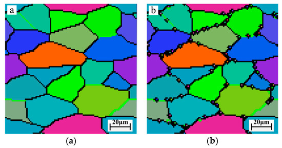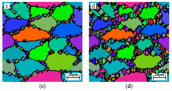 For a more intuitive display of the established models, simulations are performed for 42CrMo steel at different pre-stress, but keep the temperature and strain rate as invariant. In the simulation, a developed CA model is built to describe the process of microstructural evolution, and the simulation area is Figure 8 shows the simulation results of DRX grain sizes at pre-stress of 0, 67, 133, and 167 MPa. From the figure, it can be found that the initial grain size is about 40 μm. When pre-stress increases, a large number of equiaxed fine grains appear on the original grain boundaries, which can be found in Figure 8b–d. The sizes of DRX grains decrease from 40 μm to 25 μm with increasing of pre-stress, since the pre-stress can increase the dislocation density of thermal deformation region, promote DRX nucleation, and then refine grain size. Comparing the simulation diagrams, it can be concluded that the uniformity and numbers of grain size increase with increasing pre-stress. Therefore, appropriately increasing pre-stress is beneficial for the microstructure refinement and uniformity.