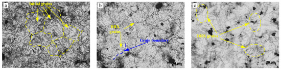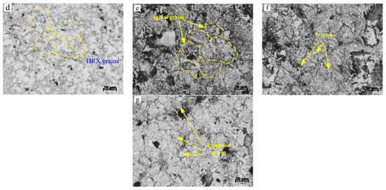 As well as pre-stress, the microstructure is also affected by grinding temperature. The results of metallographic observations at different grinding depths of 100, 150, and 250 μm are shown in Figure 9e–f. With grinding temperature increasing, the DRX fraction shows an increasing trend. The average grain sizes were measured as 39.5 μm, 38.2 μm, and 30.2 μm respectively. At a relatively high grinding temperature, usually the DRX grain will grow up, but the results are reversed because the contact time between grinding wheel and workpiece is very transient during PSHG process. Therefore, there is not enough time for DRX grain growth. Instead, DRX fraction will increase under the effect of higher thermal activation energy. It can be seen that the small equiaxed grains take place the original grains and located along the larger grains’ boundaries. However, the effect of grinding temperature on the DRX grain size is not more significant than pre-stress.