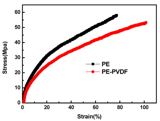 The stress-strain curves of bare PE and PE-PVDF separators.