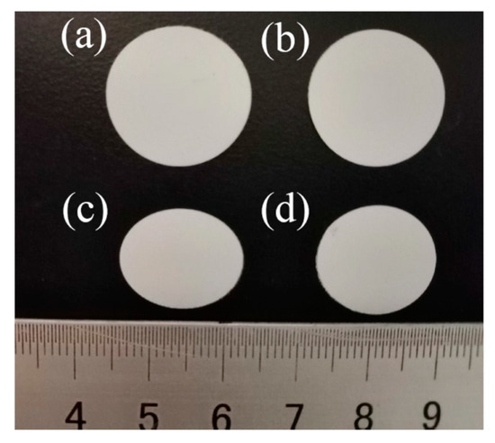 To further evaluate the influence of PVDF organic particles on the thermal stability of the separator, bare PE and PE-PVDF separators were treated at 130, 140, 150 and 160 °C for 30 min, respectively. Figure 4a,b shows the original dimensions of the bare PE and the PE-PVDF separators prior to thermolysis. Figure 4c,d shows the pictures of the bare PE and the PE-PVDF separators after heating at 140 °C for 30 min. The thermal shrinkage of the PE separator after heating at 140 °C was 52.3%; the PE-PVDF separator fared slightly better at 48%. The main reason that PVDF coating layer does not significantly improve the thermal stability of the PE-PVDF composite is that PVDF is a type of polymer as well with a lower melting point (171–175 °C, Table 1) than a ceramic coating separator [21]. As the heating temperature increased, the bare PE separator shows drastic shrinkage and appears transparent.