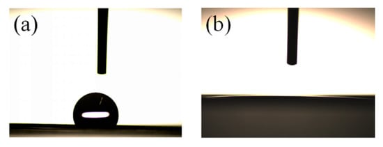 Contact angle photographs of (a) bare PE separator; (b) PE-PVDF separator.