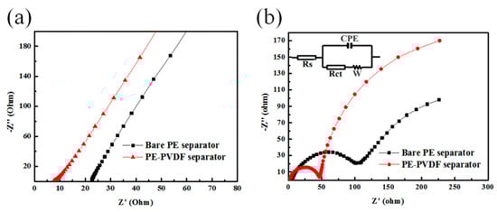 Ionic conductivity is an important and basic property for LIB separators and is obtained from Nyquist plots of the cell (stainless steel|separators soaking electrolyte| stainless steel), as shown in Figure 6a. Bulk resistance (Rb) and sample ionic conductivities are shown in Figure 6a with the values listed in Table 4. The intercepts on the real axis denotes the bulk resistance (Rb) with values of 18.18 and 8.173 Ω for the bare PE and PE-PVDF separators, respectively. Equation (4) has been used to calculate the ionic conductivity and the conductivity of the PE-PVDF separator was 1.53 mS/cm, nearly three times greater than the bare PE separator (0.55 mS/cm). The better wettability to electrolyte and higher porosity produced by interconnected and porous surface morphology of the PVDF coating layer significantly improved the ionic conductivity of the PE-PVDF separator.