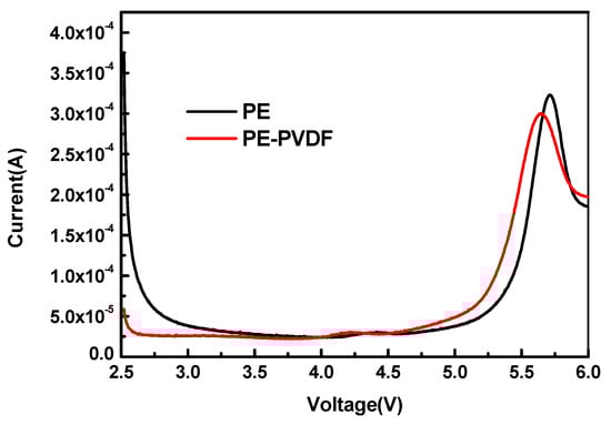 Linear sweep voltammetry of bare PE and PE-PVDF separators.