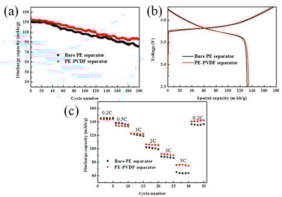 Further evaluation of the PVDF coating layer was carried out in terms of the C-rate capabilities of the half cells (NCM-111|separators soaking electrolyte|Li metal) which used different separators. As described in Figure 8c, the cells containing the bare PE separator and the PE-PVDF separator were charged-discharged continuously at different current densities of 0.2, 0.5, 1, 2, 3 and 5 C, and then back to 0.2 C for five cycles at each C-rate. For both half cells containing the bare PE separator and the PE-PVDF separator, the discharge specific capacity of the cells gradually decreased as the current density increased due to incomplete lithium ion intercalation and deintercalation into the crystal lattice of the negative and positive electrode materials [31]. The first discharge capacities of cells containing the bare PE separator and the PE-PVDF separator were 145.69 and 144.27 mAh/g at 0.2 C, respectively. When the current densities were increased to 1, 2, 3 and 5 C, the first discharge specific capacities of the cells with the bare PE separators were 122.58, 102.22, 88.58 and 64.56 mAh/g; the capacity retention rates were 96.90%, 97.13%, 97.84% and 97.4%. However, the first discharge specific capacities of the cells with the PE-PVDF separators were 122.43, 106.50, 92.34 and 75.86 mAh/g; the capacity retention rates were 99.67%, 99.07%, 98.02% and 98.82%. Obviously, the discharge capacity of the cell using the bare PE separator was slightly higher than that of the PE-PVDF separator at a lower charge density (0.2 C). However, when the charge-discharge ratios of the cells were increased to 2 and 3 C, the cell containing the PE-PVDF separator had higher discharge specific capacities and charge capacity retention rates. At the current density of 5 C, this advantage was even more significant. The better retention of the electrolyte for the PVDF coating layer helps explain the above results, which significantly impacts ionic conductivities as shown in Figure 6—especially at high C rates [22]. In conclusion, the rate capabilities of the bare PE and PE-PVDF separators align well with the ion conductivity values and electrolyte uptakes as discussed above. Thus, the PE-PVDF separator makes for a good choice for LIB applications due to its excellent rate capacity property and optimized electrochemical stability.