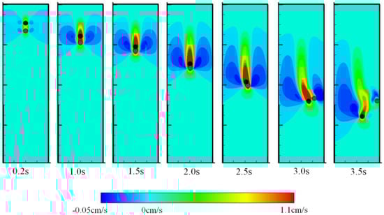 Figure 1 shows the positions of two particles as well as the flow field at seven different times. It must be pointed out that the Drafting, Kissing and Tumbling (DKT) motion that is observed in Figure 1 was also observed by Patankar et al []. As illustrated in Figure 1, in the beginning, because of the influence of the wake of the bottom particle, the resistance due to water to the upper particle is smaller, causing a larger speed than the bottom particle. Thus, the upper particle will slowly catch up with the bottom one. Since the two particles are initially slightly offset in the x direction, when the contact occurs, tumbling occurs and the upper particle with higher speed will gradually go over the bottom particle. This phenomenon is the typical drafting, kissing, and tumbling (abbreviated as DKT) process from Bakhshian and Sahimi [], and Bakhshian et al. [].